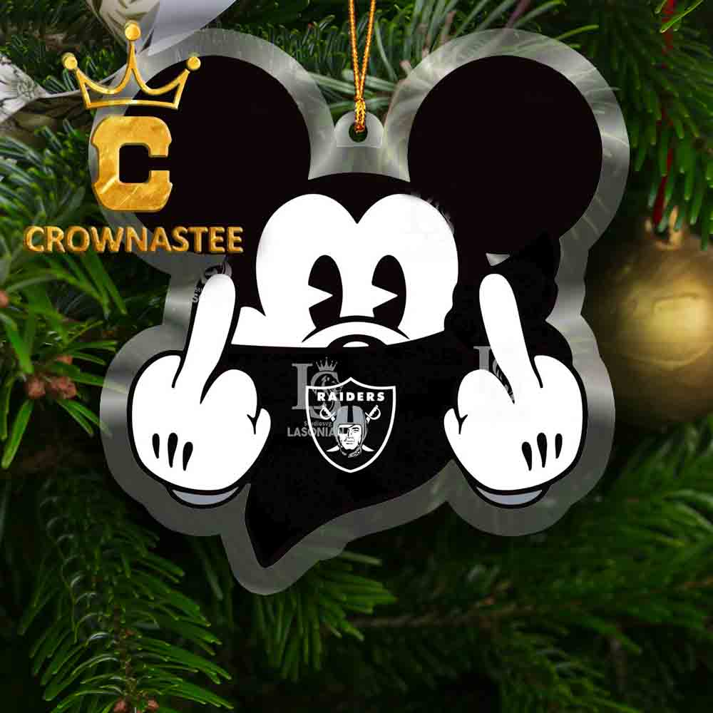 Las Vegas Raiders Mickey Mouse Middle Hand NFL Acrylic Christmas Tree Decoration Ornament Our custom ornaments blend elegant design with advanced printing technology. They are both visually stunning and long-lasting. We print on both sides using premium UV printing technology. This process captures every detail with vibrant colors and high clarity. The finish resists fading over time. Use them to decorate your Christmas tree, windows, or living room. They also make thoughtful gifts that add charm and sophistication to any space.We craft each ornament from high-quality materials that are lightweight yet durable. You can hang them anywhere without worrying about damage. Each piece includes a pre-drilled hole and a random hanging string. The size is 2.87 x 2.87 inches, perfect for both small spaces and larger displays.