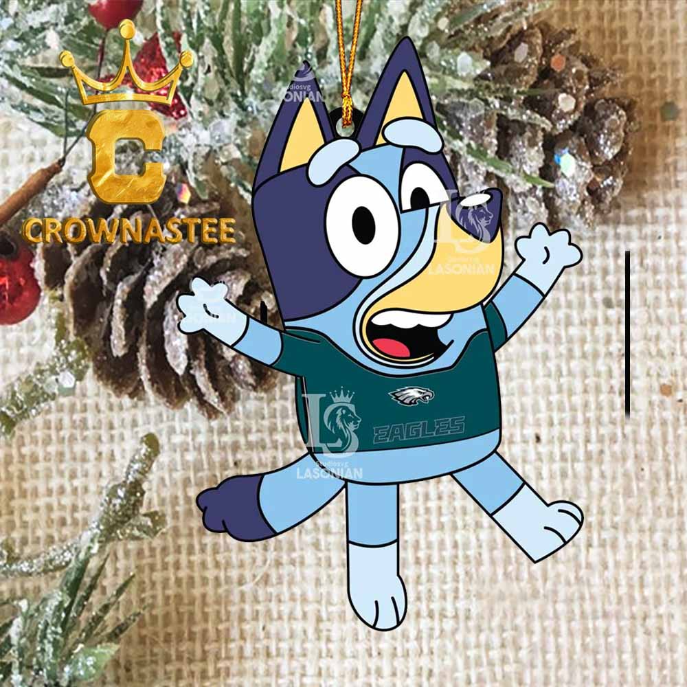 Philadelphia Eagles Bluey NFL Christmas Tree Decoration Ornament Our custom ornaments blend elegant design with advanced printing technology. They are both visually stunning and long-lasting. We print on both sides using premium UV printing technology. This process captures every detail with vibrant colors and high clarity. The finish resists fading over time. Use them to decorate your Christmas tree, windows, or living room. They also make thoughtful gifts that add charm and sophistication to any space.We craft each ornament from high-quality materials that are lightweight yet durable. You can hang them anywhere without worrying about damage. Each piece includes a pre-drilled hole and a random hanging string. The size is 2.87 x 2.87 inches, perfect for both small spaces and larger displays.
